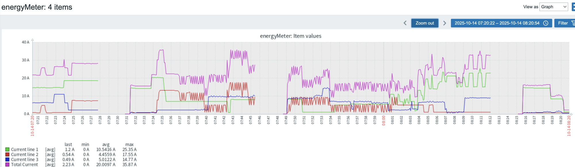 - Струм (A) — сила струму на фазі.