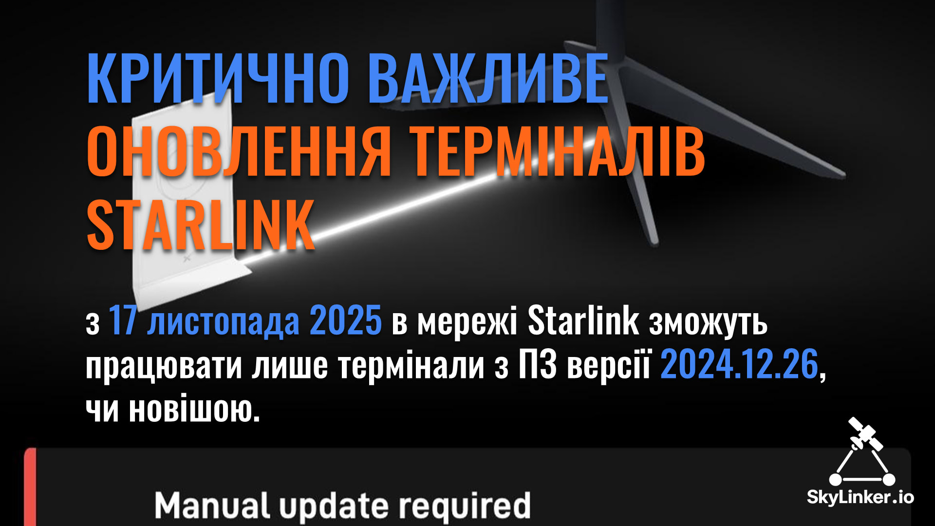 З 17 листопада 2025 в мережі Starlink зможуть працювати лише термінали з ПЗ версії 2024.12.26, чи новішою.