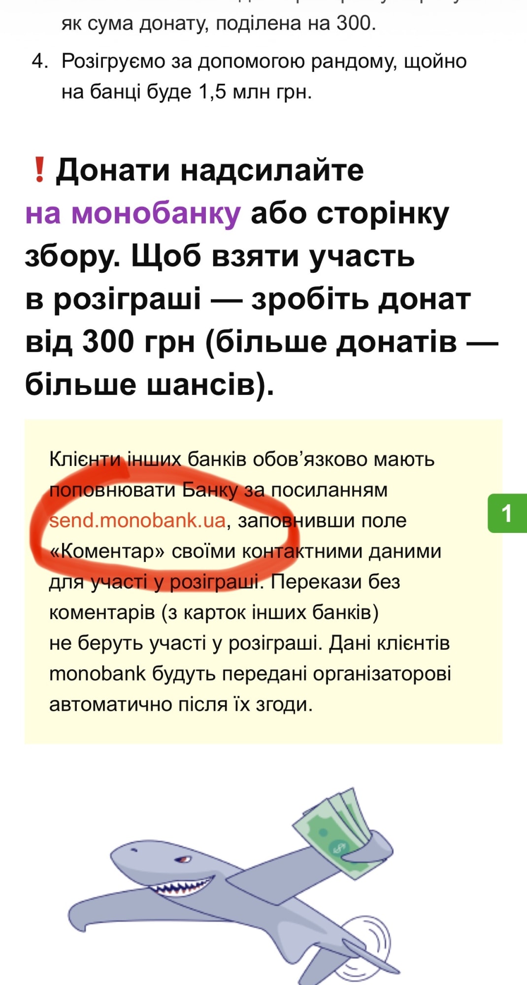 - Участь в розіграші беруть донати, зроблені саме на цю монобанку або сторінку збору.