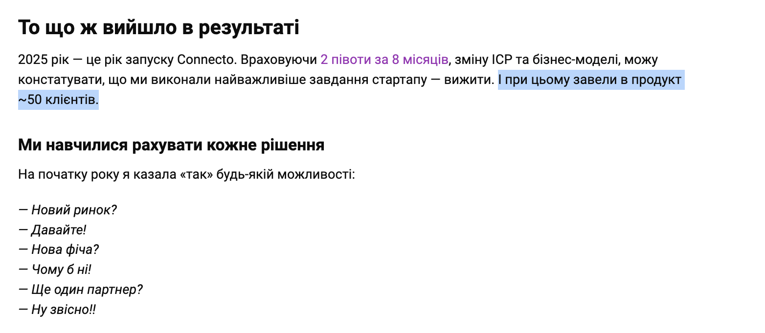 2025 рік — це рік запуску Connecto. Враховуючи 2 півоти за 8 місяців, зміну ICP та бізнес-моделі, можу констатувати, що ми виконали найважливіше завдання стартапу — вижити. І при цьому завели в продукт ~50 клієнтів.