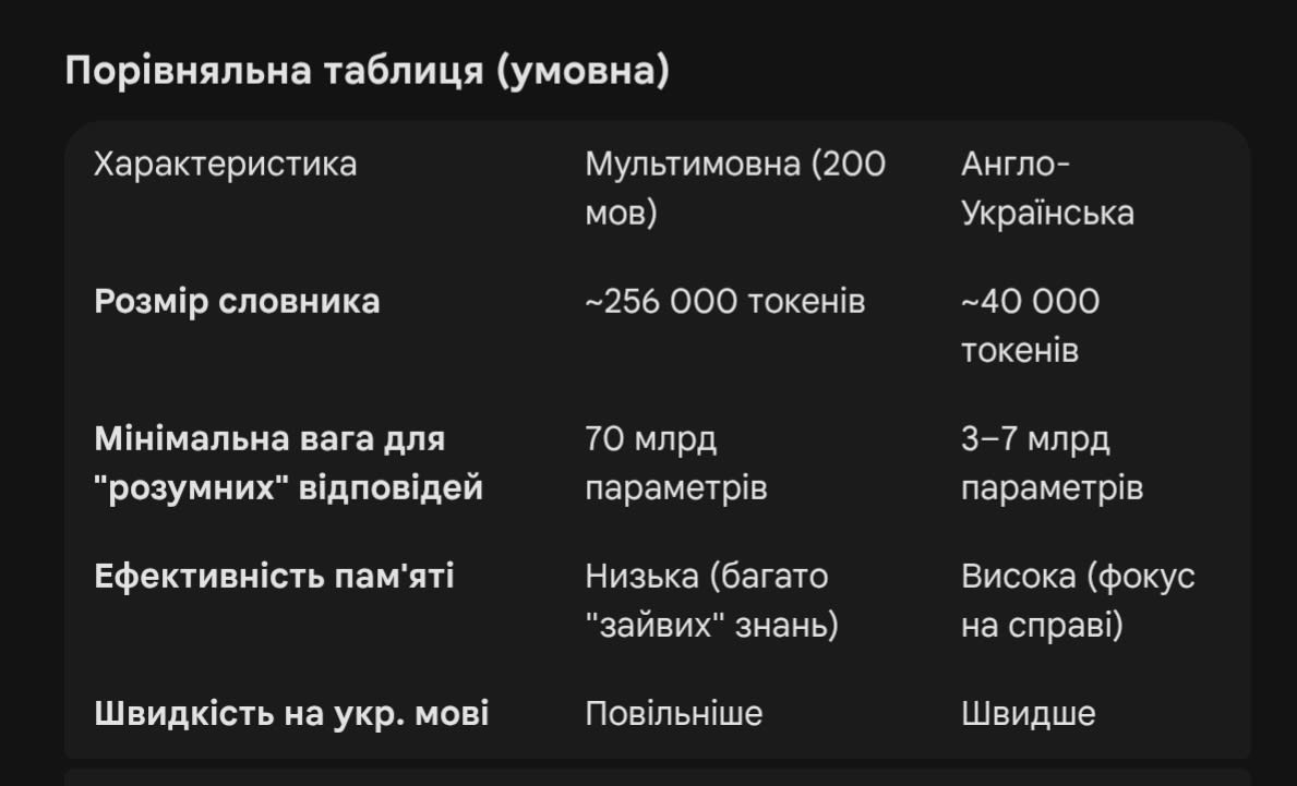 Але чи хочемо ми вчити нашу рідну LLM англійської, німецької, французької? Та якось не дуже, нам аби української її навчити ресурсів вистачило...