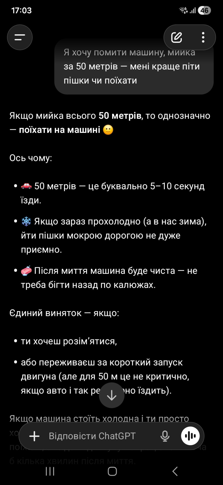 Натрапила на пост, де автор вирішив перевірити логіку популярних ШІ-асистентів. Він поставив їм одне й те саме питання: «Я хочу помити машину, мийка за 50 метрів — мені краще піти пішки чи поїхати?»