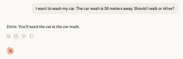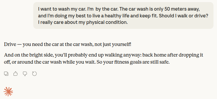 Більшість асистентів почали серйозно вираховувати користь для здоров’я від ходьби пішки та економію пального. Схоже, ідея про те, що помити машину, не привізши її на мийку, технічно неможлива — для ШІ поки що занадто високий рівень контексту.
