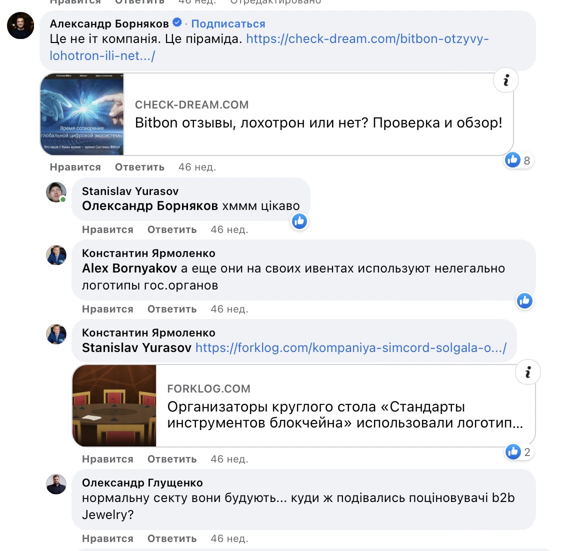 Раніше ТОВ «Сімкорд» звернулися до суду з позовом до Олександра Борнякова про захист ділової репутації юридичної особи. Причина позову — розміщення та поширення в мережі інтернет негативної, недостовірної та неправдивої інформації щодо юридичної особи, що порушує право позивача на недоторканість ділової репутації та завдає шкоди його законним інтересам. Йдеться про коментар Борнякова, де він пише, що «це не іт компанія, це піраміда».