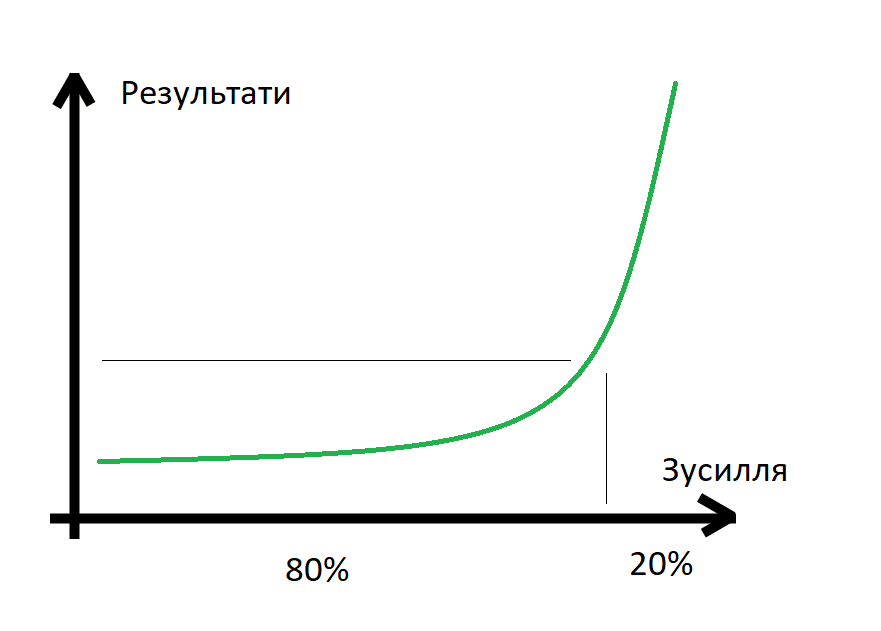 Відповідно до цього принципу, результати не залежать від зусиль лінійно — ця залежність експоненціальна. Перші 80% докладених зусиль можуть майже не давати видимого ефекту, але потім результати починають стрімко зростати, навіть без додаткових зусиль. Щоб увійти в зону справжнього прориву, необхідно подолати те саме